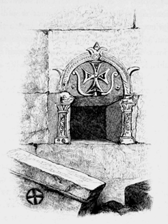 After passing the second propylon, the travel group finds itself in the portico which is painted and open in the center like a Roman atrium.29 Edwards reports that “a Greek cross cut deep into the side of the shaft stamps upon each pillar the seal of Christian worship”.30 The portico was turned into a chapel dedicated to St. Stephen, with a rough-hewn niche in the Eastern wall and an overturned credence-table. Both the niche and the credence-table were decorated with Byzantine carvings and a cross (see fig. 4).31 A Greek inscription on the wall says: “This good work was done by the well-beloved of God, the Abbott-Bishop. Theodore”.32