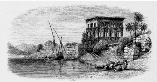 Edwards describes Philae as still perfectly intact and framed by rocks on both sides. 24They approached the island from its southern end because here was its original landing-place. The empty socket of the so-called Philae obelisk and another obelisk remaining in situ can be seen here.25 From there, the travel group first passed under the so-called “Pharaoh’s Bed” (see fig. 3), a little roofless temple which as Edwards emphasizes was the object of many paintings and photographs taken at Philae.26 She mentions a great temple with irregular shapes and angles and between the colonnades of the courtyard the brick foundations of a Coptic village which Edwards dates to the early Christian time. The inner court is also of an erratic quadrangular shape and framed by an open colonnade on the East and a chapel in the West, decorated with Hathor-columns at its front side. Edwards states that the chapel dedicated to Hathor and the birth of her son Horus was built by Ptolemy Euergetes III27 and that Jean-François Champollion named it mammisi.28